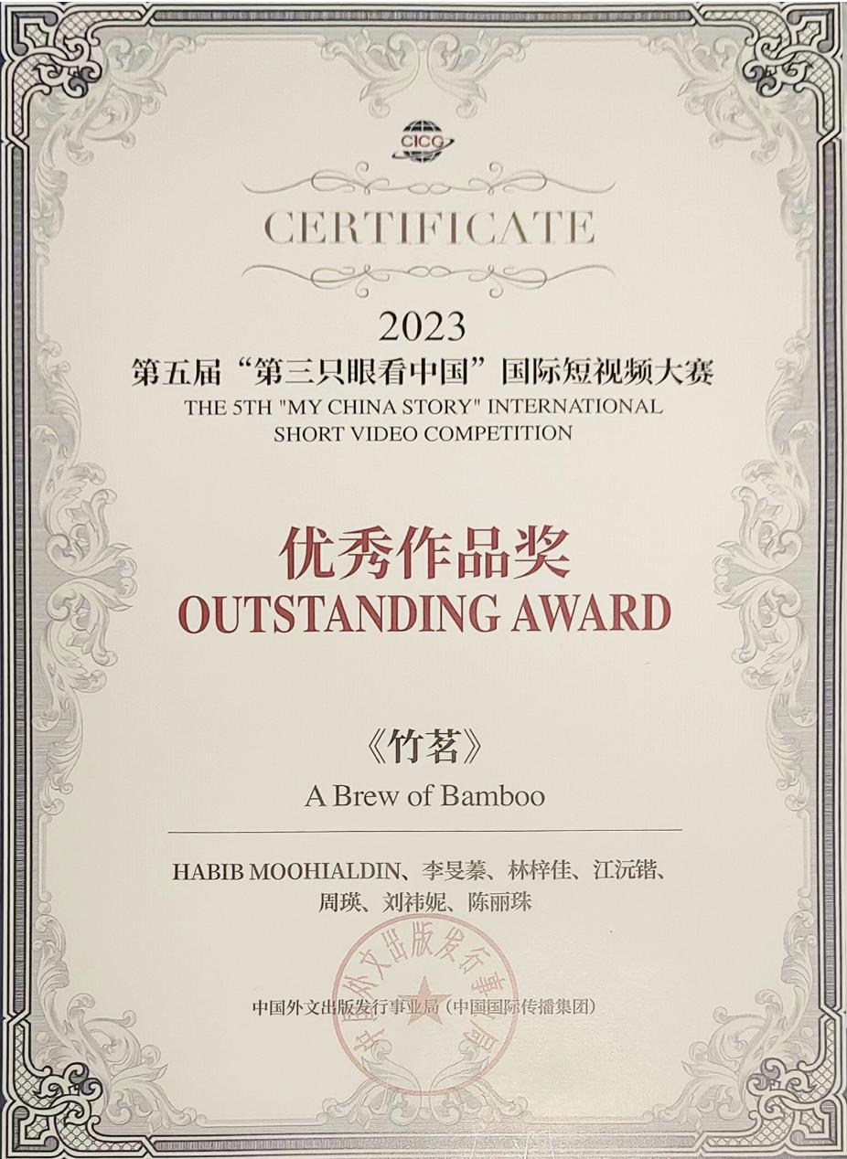 由我校学生林梓佳、李旻蓁等人与来自也门的外国青年MOOHIALDIN BA HABIB ALI ISMAIL(碧海)共同创作的影片《竹茗》在2023年第五届“第三只眼看中国”国际短视频大赛中脱颖而出,荣获优秀作品奖。
