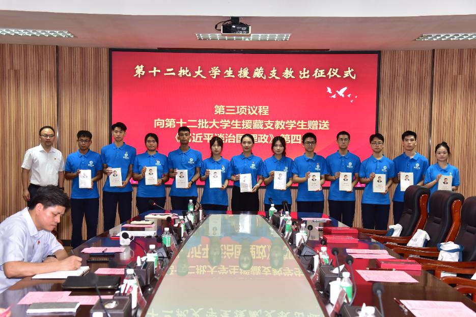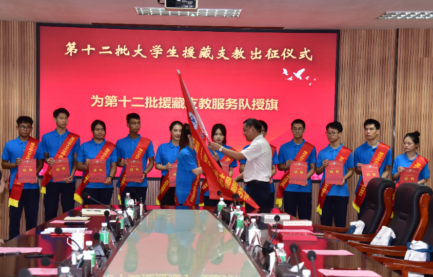 仪式上,吴业春向支教服务队颁发证书、授旗,相关职能部门领导及二级学院领导为服务队队员佩戴绶带,并赠送《习近平谈治国理政》第四卷等学习资料和爱心礼包。曹阳带领全体援藏支教队员进行出征宣誓。