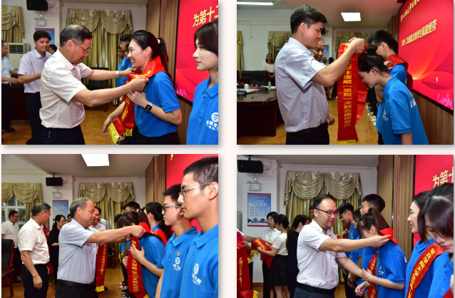 吴业春和相关部门及二级学院领导为支教师生佩戴绶带