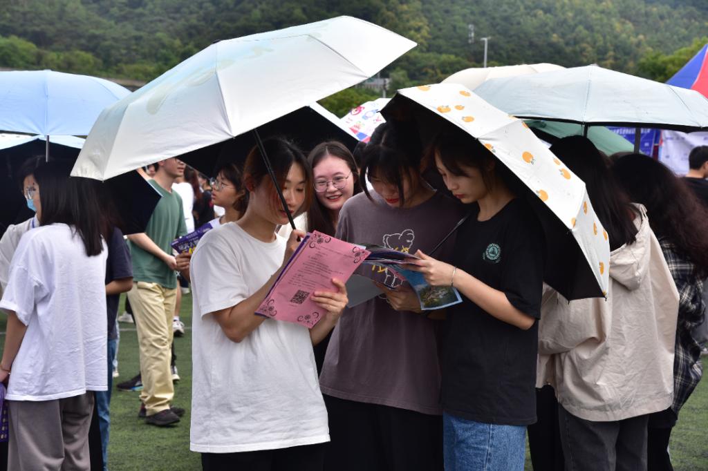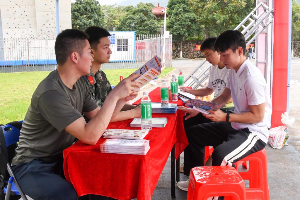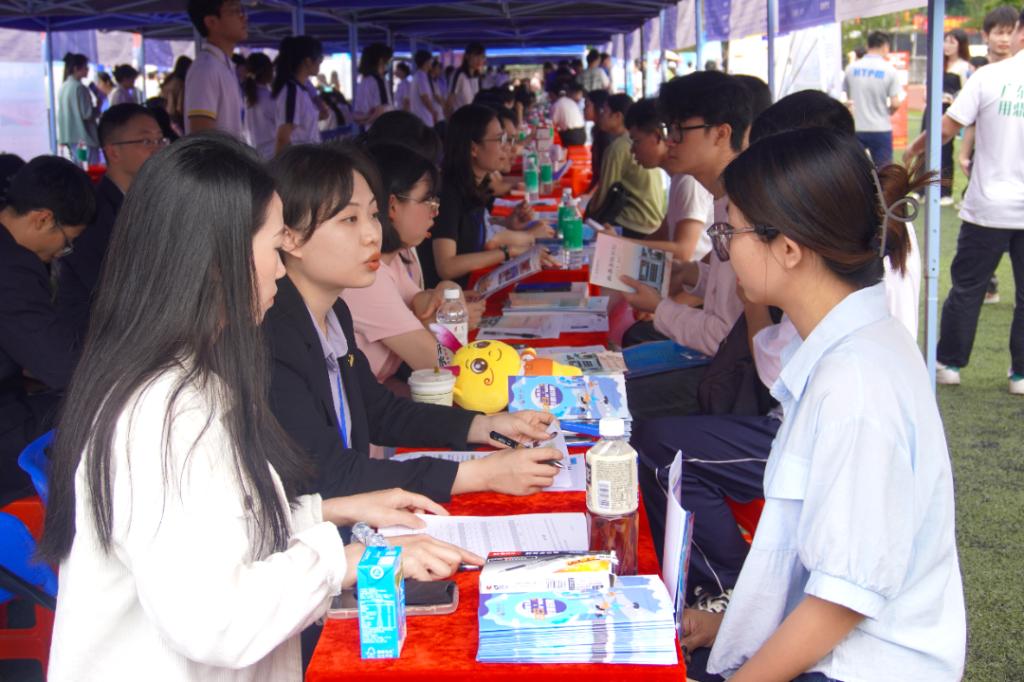 招聘摊位前,招聘工作人员主动向前来求职的毕业生派发人才招聘宣传单,热情讲解岗位情况并解答疑惑,与毕业生深入交流或进行现场面试。