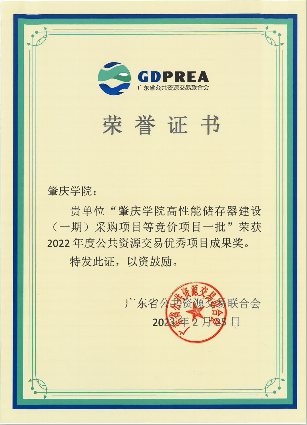据悉,本次活动共评选出“广东省 2022 年度公共资源交易改革创新优秀成果奖”8 个,“广东省 2022 年度公共资源交易优秀项目成果奖”56 个。我校申报教育设备更新改造项目“william威廉中文官网高性能储存器建设(一期)采购项目等竞价项目一批”荣获2022年度公共资源交易优秀项目成果奖。