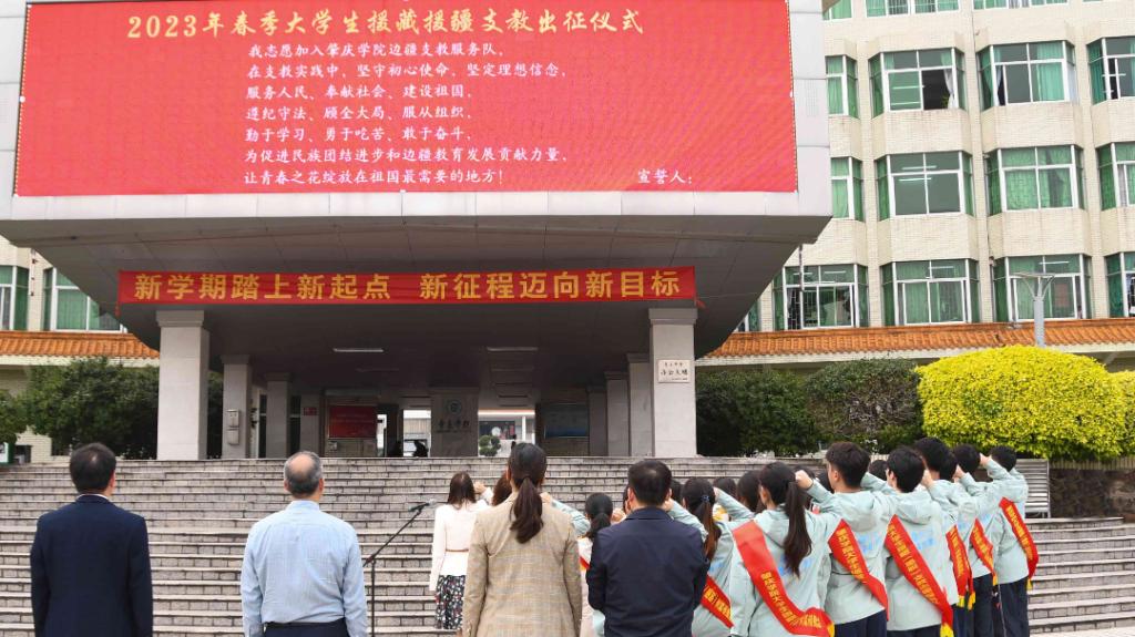 活动向支教服务队颁发证书、佩戴绶带和授旗,并赠送学习资料和爱心礼包。全体援藏援疆支教队员进行了出征宣誓。