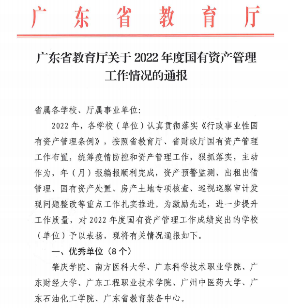 本网讯 日前,广东省教育厅发布了《广东省教育厅关于2022年度国有资产管理工作情况的通报》,文件依据2022年度年(月)编报情况、资产预警监测、出租出借管理、国有资产处置、房产土地核查专项检查、巡视巡察整改等情况,对全省20个单位进行通报表扬,其中我校获评高校国有资产管理工作“优秀单位”称号,成为全省8个获得该殊荣的高校。