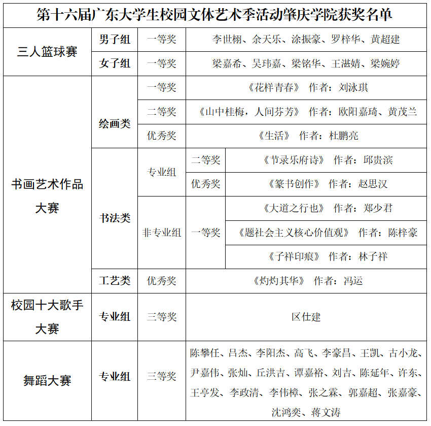 本网讯 日前,由共青团广东省委员会、广东省教育厅、广东省文化和旅游厅、广东省体育局、广东省学生联合会联合举办的第十六届广东大学生校园文体艺术季获奖名单正式公布。我校共有13个作品/团队在本次竞赛中获奖,其中一等奖6项、二等奖2项、三等奖2项、优秀奖3项。学校也获评“优秀组织奖”。