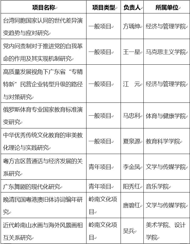 本网讯 近日,广东省社科规划2024年度常规项目及三类研究专项的立项名单公布。我校在本次评选中表现出色,共荣获9项资助项目,这一数字相较去年实现了80%的显著增长,并创下了近五年来的新高。在获资助的项目中,包括5项一般项目、2项青年项目及2项岭南文化项目。这一佳绩不仅展示了我校在社科研究领域的进步与潜力,也为我们未来在该领域的持续发展奠定了坚实基础。
